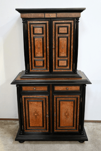 Ce meuble est un exemple caractéristique du style **Louis XV**. Voici quelques points qui justifient cette identification : 1. **Pieds galbés** : Les pieds du meuble sont incurvés, ce qui est typique de la période Louis XV. Ce style privilégie les formes courbées et les lignes sinueuses. 2. **Placage marqueté** : Les panneaux de porte montrent un motif en chevrons réalisé en placage de bois précieux, ce qui est également typique du style Louis XV. Cette technique de marqueterie était très prisée à cette époque pour ses effets décoratifs raffinés. 3. **Ornementation en bronze doré** : Les poignées en bronze doré avec des formes décoratives sophistiquées sont une autre caractéristique indicative de ce style. 4. **Dimensions et proportions** : Les meubles Louis XV ont souvent des proportions équilibrées et élégantes, avec une touche de légèreté visuelle. Par conséquent, plusieurs éléments caractéristiques du style Louis XV sont présents dans ce meuble, confirmant son appartenance à cette période artistique.